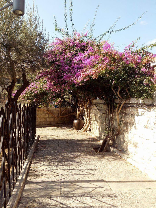 Elég nehezen találtuk meg, bármennyire is furán hangzik. Bemenni nem is tudtunk, és egy része magántulajdonban van. Mindenek ellenére az kis darabka kert magáért beszélt. Azok a kövek, az apró olajfa levelek, a fák törzseinek lágy bemélyedései...az a szerető gondoskodás, ahogy a kertész munkálkodott, ezeket látva tudtam, hogy jó kezekben van. Mellette egy templom áll, körülötte padok, persze csak a kerítés másik oldalán.